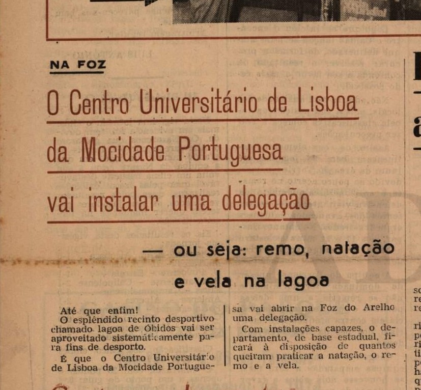 A criação de uma delegação do Centro Universitário de Lisboa da Mocidade Portuguesa na Foz do Arelho, que não se verificou, é uma das notícias interessantes da edição do dia 13. Tal possibilitaria a prática de remo, natação e vela na Lagoa de Óbidos. “Até que enfim! O esplêndido recinto desportivo chamado lagoa de Óbidos vai ser aproveitado sistematicamente para fins de desporto”, lê-se. “Com instalações capazes, o departamento, de base estadual, ficará à disposição de quantos queiram praticar a natação, o remo e a vela”, complementa a Gazeta das Caldas.