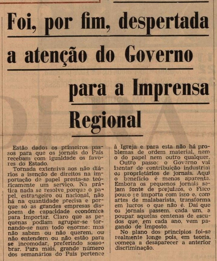 Esta situação é também abordada noutro artigo. “Foi, por fim, despertada a atenção do Governo para a Imprensa Regional”, lê-se na primeira página do dia 13. O artigo conta que “estão dados os primeiros passos para que os jornais do País recebam com igualdade os favores do Estado” e que, “tornada extensiva aos não diários a isenção de direitos na importação de papel presta-se teóricamente um serviço”. Só que, “na prática nada se resolve porque o papel, estrangeiro ou nacional, não há na quantidade precisa e porque só as grandes empresas dispoem de capacidade económica para importar. Claro que as pequenas podiam agrupar-se tornando-se num todo enorme: mas não sabem ou não querem, ou não entendem ou não estão para se incomodar, preferindo sossobrar. Para mais, grande número dos semanários do País pertence à Igreja e para esta não há problemas de ordem material, nem o do papel nem outro qualquer”, aponta.