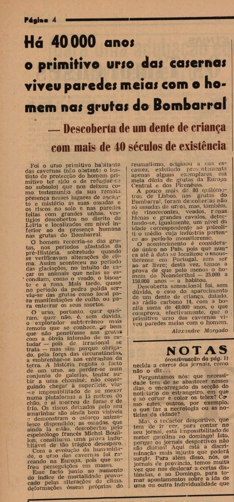 Na mesma edição destaque ainda para o seguinte título: “Há 40000 anos o primitivo urso das casernas viveu paredes meias com o homem nas grutas do Bombarral; descoberta de um dente de criança com mais de 40 séculos de existência”. O jornal recorda que “foi o urso primitivo habitante das cavernas (não obstante o instinto de protecção do homem primitivo ter sido o de refugiar-se no subsolo) que nos deixou como testemunho da sua remota presença nesses lugares de encanto e mistério as suas ossadas e os riscos no solo e nas paredes feitas com grandes unhas, vestígios descobertos no distrito de Leiria e localizados em nível inferior ao da presença humana nas grutas do Bombarral”.