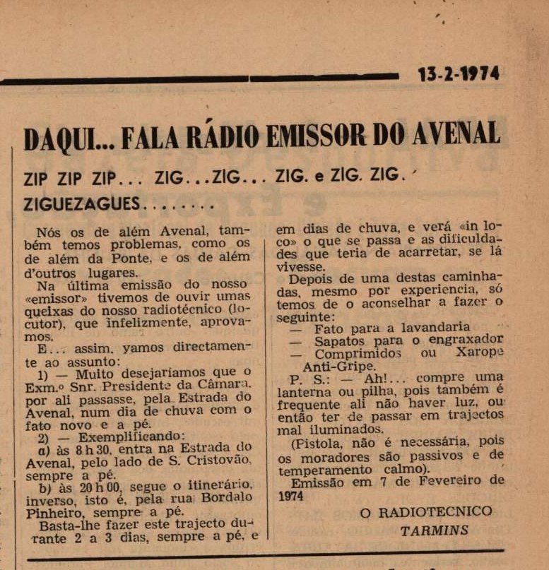 Na edição do dia 13 temos ainda um curioso artigo titulado assim: “Daqui… Fala Rádio Emissor do Avenal Zip Zip Zip… Zig… Zig… Zig. e Zig. Zig. Ziguezagues…..”. Conta que “nós os de além Avenal, também temos problemas, como os de além da Ponte, e os de além d’outros lugares. Na última emissão do nosso «emissor» tivemos de ouvir umas queixas do nosso radiotécnico (locutor), que infelizmente, aprovamos. E… assim, vamos directamente ao assunto: 1) Muito desejaríamos que o Exm. Snr. Presidente da Câmara, por ali passasse, pela Estrada do Avenal, num dia de chuva com o fato novo e a pé. 2) Exemplificando: a) às 8h 30, entra na Estrada do Avenal, pelo lado de S. Cristovão, sempre a pé. b) às 20 h 00, segue o itinerário, inverso, isto é, pela rua Bordalo Pinheiro, sempre a pé. Basta-lhe fazer este trajecto durante 2 a 3 dias, sempre a pé, e em dias de chuva, e verá «in loco» o que se passa e as dificuldades que teria de acarretar, se lá vivesse. Depois de uma destas caminhadas, mesmo por experiencia, só temos de o aconselhar a fazer o seguinte: fato para a lavandaria, sapatos para o engraxador, comprimidos ou xarope anti-gripe. P. S.: Ah!… compre uma lanterna ou pilha, pois também é frequente ali não haver luz, ou então ter de passar em trajectos mal iluminados. (Pistola, não é necessária, pois os moradores são passivos e de temperamento calmo). Emissão em 7 de Fevereiro de 1974. O Radiotecnico TARMINS”.