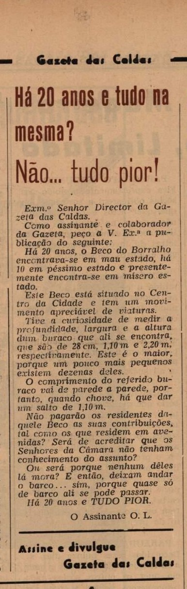 Encontramos ainda uma carta de um assinante que aponta que “há 20 anos e tudo na mesma? Não… tudo pior!” e que se refere ao Beco do Borralho. Há 20 anos “encontrava-se em mau estado, há 10 em péssimo estado e presentemente encontra-se em misero estado. Este Beco está situado no Centro da Cidade e tem um movimento apreciável de viaturas. Tive a curiosidade de medir a profundidade, largura e a altura dum buraco que ali se encontra, que são de 28 cm, 1,10 m e 2,20 m, respectivamente. Este é o maior, porque um pouco mais pequenos existem dezenas deles. O comprimento do referido buraco vai de parede a parede, portanto, quando chove, há que dar um salto de 1,10 m. Não pagarão os residentes daquele Beco as suas contribuições, tal como os que residem em avenidas? Será de acreditar que os Senhores da Câmara não tenham conhecimento do assunto? Ou será porque nenhum dêles lá mora? E então, deixam andar o barco… sim, porque quase só de barco ali se pode passar. Há 20 anos e tudo pior”, termina.