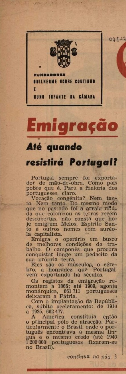 A peça, que continuava na edição seguinte, trazia um subtítulo: “em cada mês seis aldeias despovoadas”. E prosseguia: “até que ponto poderá sobreviver uma nação que perde anualmente 100000 dos seus filhos, precisamente naquela idade em que mais necessários são para o trabalho? As estruturas do país, principalmente rurais, começam a ressentir-se. Mensalmente partem 2284 famílias, representando estatísticamente a morte de seis aldeias. A pirâmide de idades está a distorcer-se (menos de 50 000 nascimentos o ano passado), motivando gradual envelhecimento da população. Os campos estão abandonados. A emigração (e a guerra no Ultramar) leva os homens”.