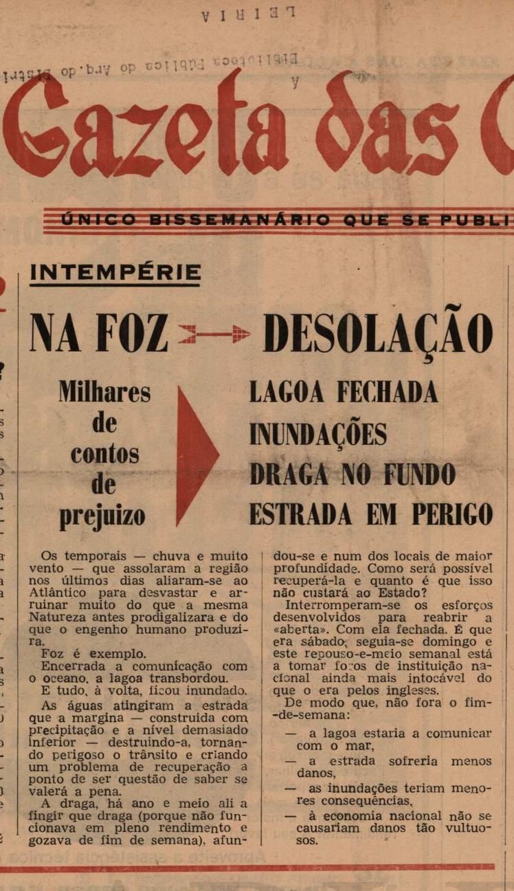 “Intempérie na Foz; Desolação; Milhares de contos de prejuízo; Lagoa Fechada; Inundações; Draga no fundo; Estrada em perigo”, lê-se na primeira página do dia 16 de fevereiro de 1974. “Os temporais – chuva e muito vento que assolaram a região nos últimos dias aliaram-se ao Atlântico para desvastar e ruinar muito do que a mesma Natureza antes prodigalizara e do que o engenho humano produzira. Foz é exemplo. Encerrada a comunicação com o oceano, a lagoa transbordou. E tudo, à volta, ficou inundado. As águas atingiram a estrada que a margina – construida com precipitação e a nível demasiado inferior – destruindo-a, tornando perigoso o trânsito e criando um problema de recuperação a ponto de ser questão de saber se valerá a pena”, lê-se na Gazeta.