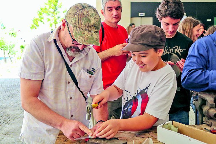 Gastão, de 11 anos, costuma ajudar, porque gosta e porque “é o nosso companheiro de aventuras”, dizem os pais orgulhosos. No caso das facas, como o filho “pratica actividades de sobrevivência no mato, esta arte tem especial importância”.