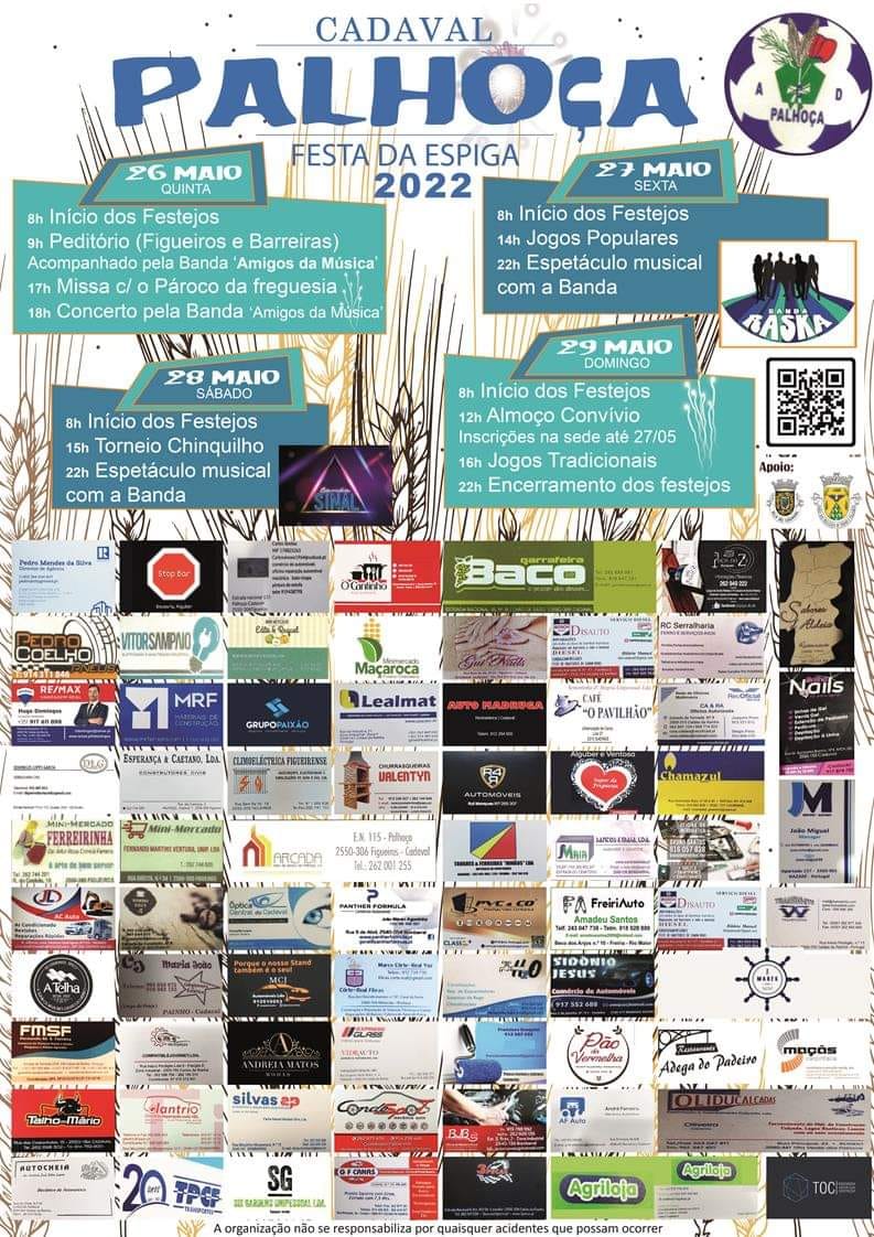 A Festa da Espiga na Palhoça (Cadaval) decorre entre os dias 26 e 29 de maio. Para o primeiro dia está previsto o peditório com “Os Amigos da Música” (que atuam também às 18h00) em Figueiros e Barreiras e a missa (17h00).