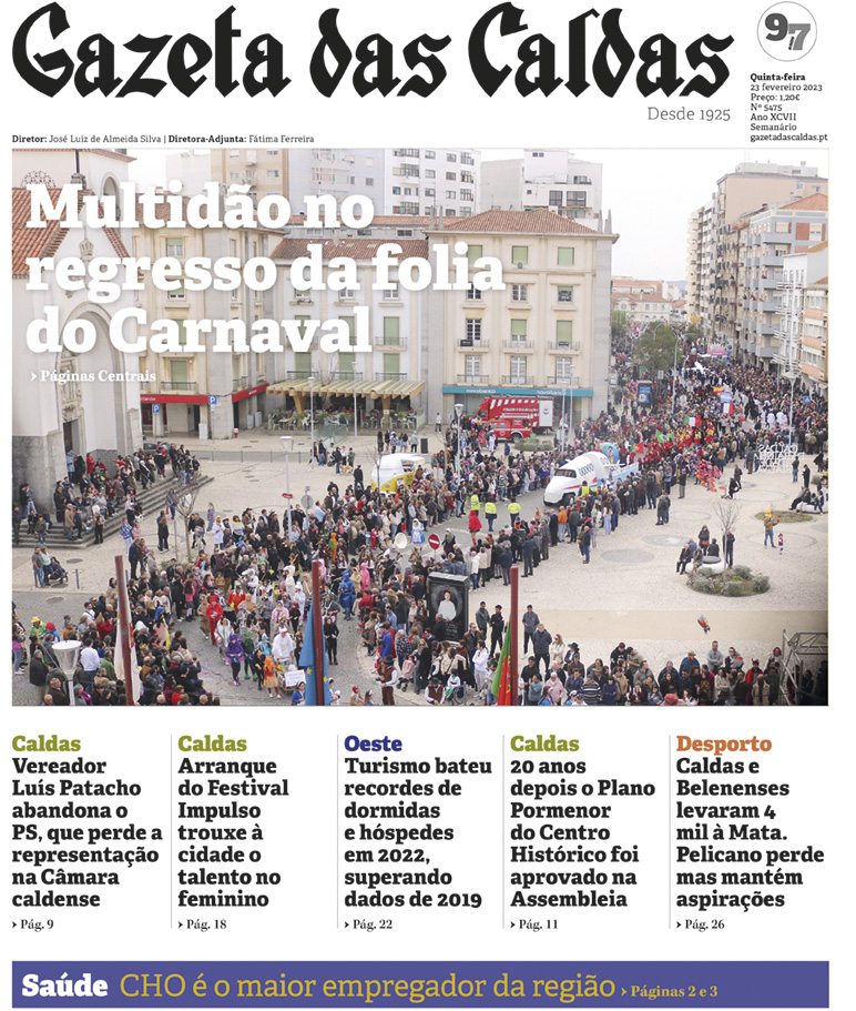 A 23 de fevereiro, o Carnaval é tema de primeira página. Tudo porque uma verdadeira multidão regressou aos festejos de rua, tal como pode ler-se nesta edição que dá a conhecer como foi a folia por toda a região oestina. Nas Caldas, um dos temas em foco nos desfiles foi a Saúde. Na Política dá-se a conhecer que vereador da Câmara Municipal das Caldas da Rainha desde outubro de 2017, Luís Patacho se desfiliou do PS, mas continuou como vereador, agora na situação de independente. É notícia também que duas décadas depois da deliberação da Assembleia Municipal para a sua elaboração, o Plano de Pormenor de Reabilitação Urbana do Centro Histórico das Caldas da Rainha foi, aprovado, por unanimidade, no mesmo órgão autárquico.