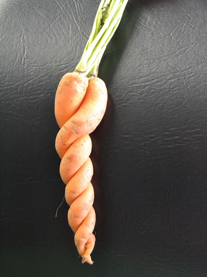 É uma cenoura biológica e nasceu entrelaçada com uma congénere. Parece uma espiral feita manualmente, mas na verdade foi a natureza que quis que assim nascessem duas cenouras completamente enroladas. Este original espécime foi apanhado num terreno do Olho Marinho que pertence a Patrício Pereira, que vende hortícolas na Praça da Fruta.
