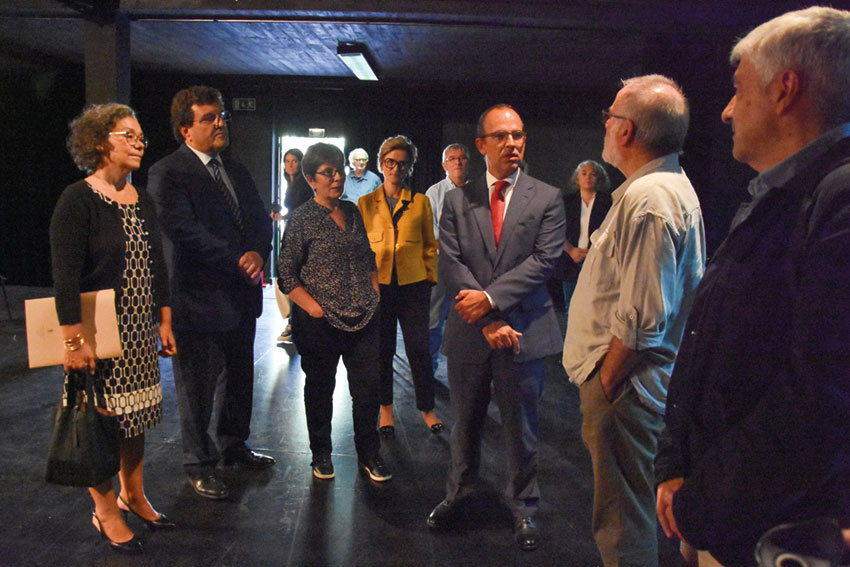 Na quarta-feira, 20 de setembro, o ministro da Cultura, Pedro Adão e Silva, veio às Caldas ao Teatro da Rainha e à sede do Coletivo Osso, em São Gregório. A comitiva integrou Susana Menezes, da direção Regional de Cultura do Centro e Américo Rodrigues, diretor-geral das Artes (DGArtes), assim como o presidente Vítor Marques e os vereadores Conceição Henriques e Joaquim Beato. Na Sala Estúdio do Teatro da Rainha, o governante assistiu, durante alguns minutos, ao ensaio de “Antigonick”, peça de Anne Carson, que estreará em novembro. O diretor do grupo, Fernando Mora Ramos, deu a conhecer a história da companhia e o anseio de constituir um Centro de Experimentação Dramática e de Formação. O ministro conheceu também a maqueta do edifício sede, projetada para a Praça da Universidade e cuja construção se encontra suspensa. O governante ainda foi conhecer o Coletivo Osso, que fica em S. Gregório, e cujo trabalho cultural também envolve a comunidade local.