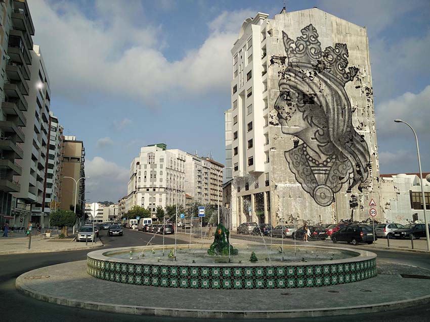 Uma fotomontagem com a Rainha D. Leonor, partilhada no Facebook, serviu de mote para a ideia de embelezar uma parede cega de um prédio em frente à estação de comboios. O objectivo seria utilizar a arte urbana para retratar o universo bordaliano. João e Diogo Olivença são os caldenses que aceitaram o desafio de planear este projecto.