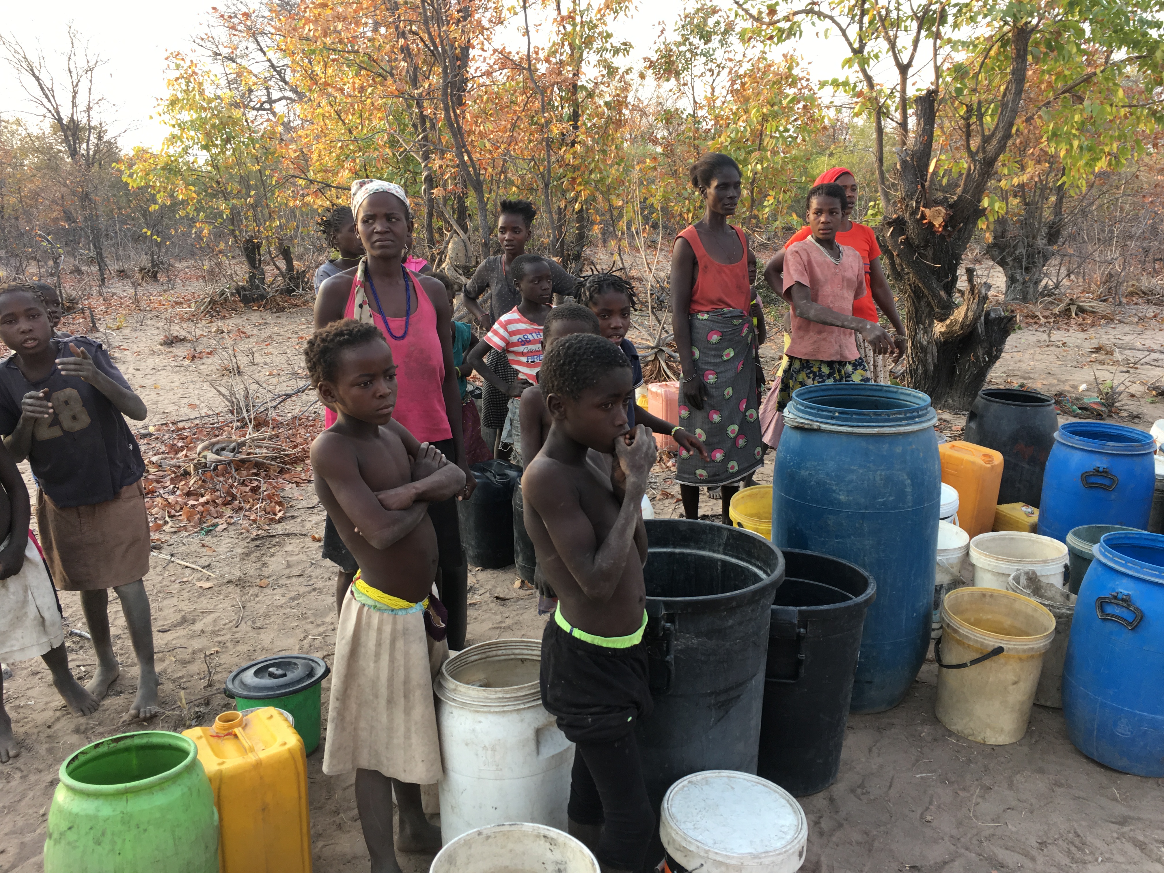 Em rigor não é uma localidade, mas sim um ponto no mapa. A população vive dispersa num raio de dezenas de quilómetros. Precisam de espaço para o gado pastar e os vizinhos estão longe uns dos outros. Mas hoje todos convergem para a missão porque vai ser distribuída ajuda alimentar. A maioria são mulheres e crianças. Os homens, há quem diga que foram caçar, mas há também quem explique que se foram embora, fugiram, emigraram para a cidade ou para a Namíbia. Ficam as mulheres, com 10, 11, 12 filhos. Paula, de 56 anos, tem 15 filhos. Vêem-se meninas com 12 ou 13 anos com um bebé às costas. Não é o irmão mais novo. É um filho.