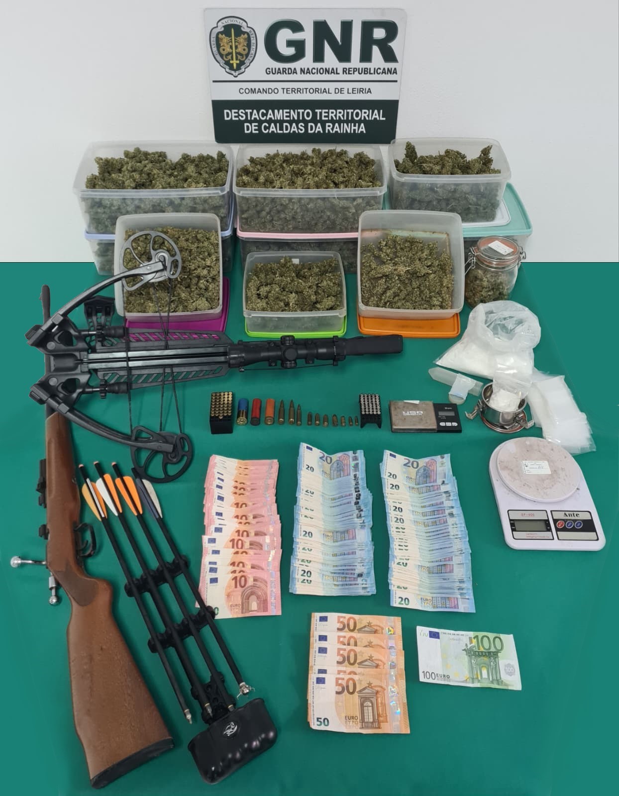 A GNR deteve em flagrante um homem de 42 anos, em Alvorninha, por tráfico de droga. “No âmbito de uma investigação por tráfico de estupefacientes, que decorria há cerca de dois meses, os militares da Guarda deram cumprimento a dois mandados de busca, um domiciliário e outro em veículo, culminando na detenção do suspeito”, explica a força militar, esclarecendo que foram apreendidos 5 340 euros em numerário, uma espingarda calibre .22, uma besta equipada com mira telescópica, 122 munições de diversos calibres, quatro virotões (flexas), três cartuchos de diversos calibres, 2 682 doses de cocaína, 886 doses de canábis, duas balanças digitais e 100 sacos herméticos utilizados para acondicionamento de estupefaciente.