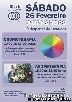 No Sábado seguinte, dia 26, irão decorrer dois workshops na sede da Olha-te (Rua de Camões nº 75 1º andar). De manhã, entre as 10 e as 13h00, o atelier irá dedicar-se à Cromoterapia e irá reflectir-se sobre a forma como a cor influencia o bem-estar. À tarde, das 15 às 19h00 o atelier vai dedicar-se à Aromaterapia. O curso da Cromoterapia custa 15 euros e o da Aromaterapia custa 20.