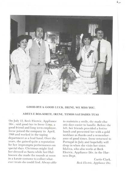 “O pai do patrão reformou-se aos 60 anos quando já não tinha forças para pegar na mala e trepar para a camioneta”, contou Irene Lima, explicando que não era isso que os patrões queriam para ela. No entanto, disseram-lhe também que, se por algum motivo se aborrecesse na sua terra natal, teria sempre as portas abertas para regressar. Irene ficou sensibilizada com tamanha homenagem e reconhecimento pelo seu desempenho e guarda com orgulho o jornal da firma onde foi publicado um texto de despedida. Nele pode ler-se que Irene Lima, funcionária que entrou para a fábrica em 1968, “sabe manter um sorriso no rosto tornando mais fáceis os dias caóticos”. Desejavam boa sorte à funcionária que chegou a liderar o departamento dos componentes eléctricos e que tinha à sua responsabilidade mais de uma dezena de funcionárias. E como a sua irmã Idalina se mantinha a trabalhar na Noma Lights, ficavam a aguardar a sua visita.