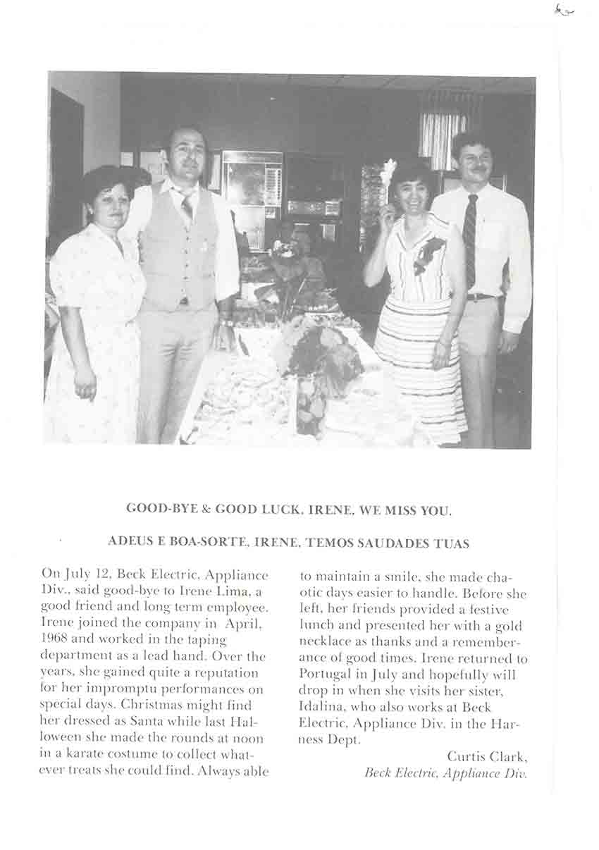 “O pai do patrão reformou-se aos 60 anos quando já não tinha forças para pegar na mala e trepar para a camioneta”, contou Irene Lima, explicando que não era isso que os patrões queriam para ela. No entanto, disseram-lhe também que, se por algum motivo se aborrecesse na sua terra natal, teria sempre as portas abertas para regressar. Irene ficou sensibilizada com tamanha homenagem e reconhecimento pelo seu desempenho e guarda com orgulho o jornal da firma onde foi publicado um texto de despedida. Nele pode ler-se que Irene Lima, funcionária que entrou para a fábrica em 1968, “sabe manter um sorriso no rosto tornando mais fáceis os dias caóticos”. Desejavam boa sorte à funcionária que chegou a liderar o departamento dos componentes eléctricos e que tinha à sua responsabilidade mais de uma dezena de funcionárias. E como a sua irmã Idalina se mantinha a trabalhar na Noma Lights, ficavam a aguardar a sua visita.