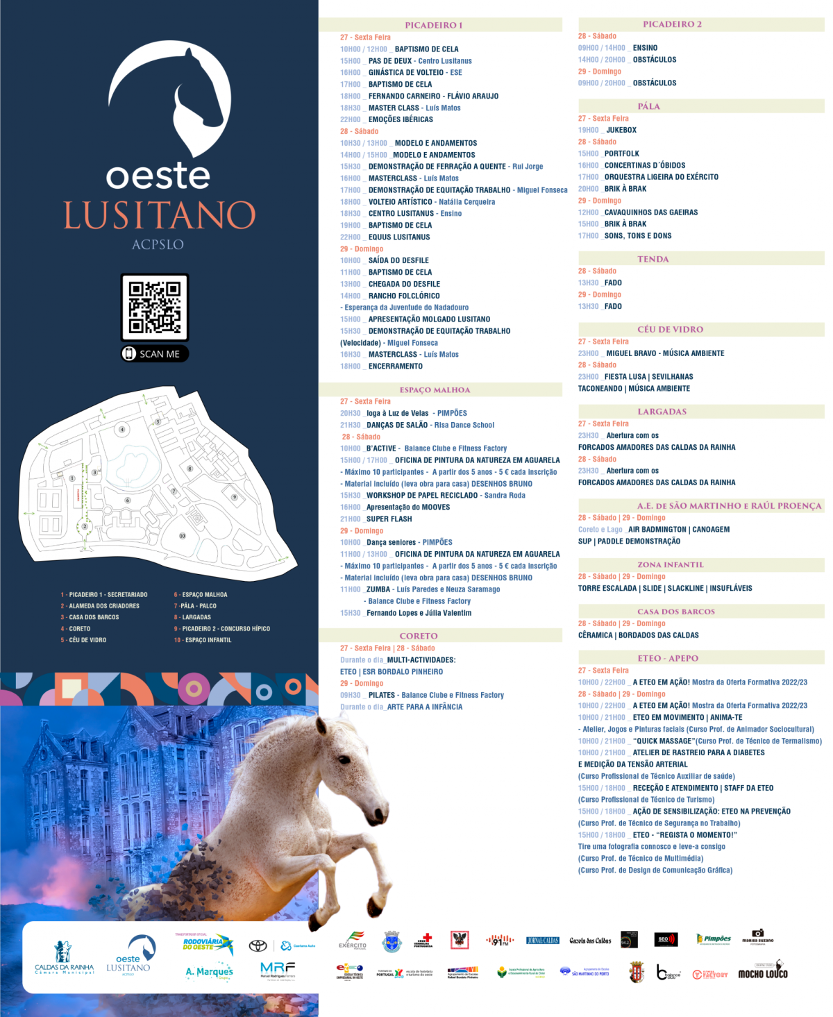 Voltando ao programa, como vem sendo hábito, o festival tem como âncora o cavalo puro sangue lusitano, mas transforma-se numa verdadeira mostra das Caldas da Rainha que se estende por todo o parque. O picadeiro principal está colocado no parque das bicicletas e o picadeiro das provas de obstáculos na zona da parada, como habitualmente, mas haverá sempre algo para ver no Coreto, no Espaço Malhoa, na Tenda, na Pala, na Casa dos Barcos e no Céu de Vidro, com as mais diversas atividades, entre as quais não faltarão os tradicionais batismos de cela, assim como o desfile equestre, na manhã de domingo, que será este ano animado por artes circenses.