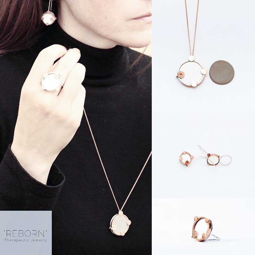 As peças em porcelana que são integradas nas peças de joalharia exalam a fragrância dos óleos essenciais e têm a capacidade de manter o cheiro. São pois jóias difusoras, explicou a autora, que anda criou outras peças Reborn tais como colares, brincos e anéis. “Fiz um mecanismo nas peças que dá para trocar as peças de porcelana e mudar óleo e a função terapêutica”, explicou a joalheira acrescentando que a sua nova coleccção se dedica aos quatro elementos – terra, ar, fogo e água – e cada uma tem um tom diferente aplicado na prata.