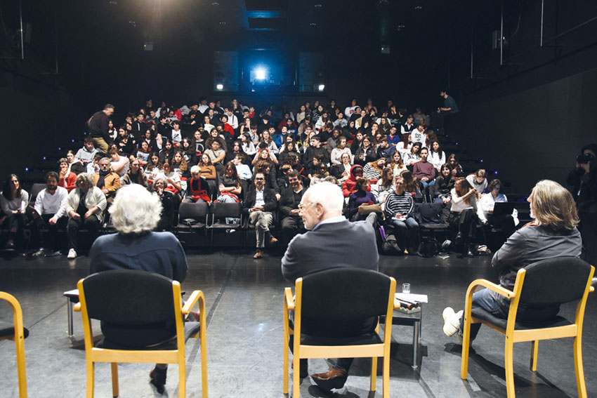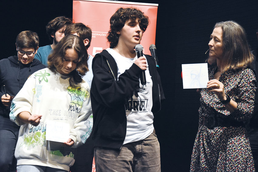 “Hoje, se fizéssemos um golpe de Estado iríamos ocupar o Youtube e o TikTok”, começou por dizer o ilustrador Nuno Saraiva, consciente que “todos vocês têm a comunicação dentro dos vossos bolsos”. Pediu aos jovens que “não normalizem” a importância do 25 de Abril e que olhem para o acontecimento como “algo que vos deixa viver livremente”. Nascido quatro anos antes da revolução, o ilustrador partilhou a sua experiência enquanto filho de um militar que combateu na Guerra Colonial em Moçambique. Dessa altura guarda a “memória do momento” em que, ainda muito criança, assistiu ao ato desesperado de um alferes, que disparou sobre o seu próprio pé para poder fugir à guerra e voltar para Portugal. “É importante celebrar Abril para que estas coisas não voltem a acontecer. Vocês são netos dos capitães de Abril, da revolta das Caldas, e devem segurar isso no coração”, concluiu.