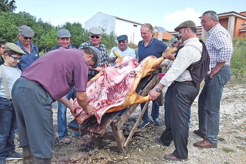 “Enquanto é limpo, o porco está deitado na mesa de cabeça para cima, mas depois é virado ao contrário para ser aberto”, explica João Mateus, a quem cabe a tarefa de esquartejar o animal. Depois de retiradas as tripas e as vísceras, a carcaça é limpa e lavada com água e depois com vinho branco.