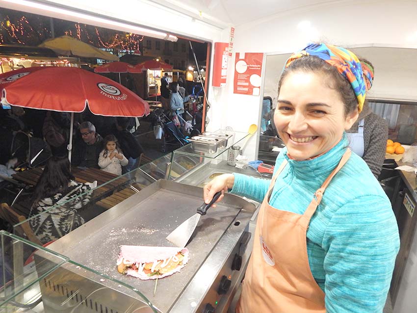 Já Edjane Souza leva-nos até ao Brasil com as suas tapiocas. Actualmente a viver em Lisboa, a brasileira decidiu investir no street food no ano passado e assim iniciar um negócio que a mantivesse próxima às suas origens. A marca Icó Original Tapioca faz referência ao nome da fazenda do seu avô, que pertence à família há seis gerações. “Sempre cultivámos mandioca e também temos uma unidade onde a transformamos em farinha”, conta Edjane Souza, explicando que a tapioca é um alimento de origem indígena feito através da mistura do amido da mandioca com água. Este preparado vai à frigideira e ganha uma forma semelhante à do crepe, sendo a sua textura crocante nas pontas e gelatinosa no centro. “Tanto pode ser doce como salgada, mas é um alimento muito saudável, é livre de glúten e rico em vitaminas e minerais”, acrescenta a brasileira, que nos recomenda a tapioca preta (feita com tinta de choco), a tapioca cor-de-rosa (feita com sumo de beterraba) e a tapioca de café se preferirmos uma sobremesa.