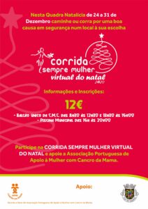 A Câmara do Cadaval aderiu à “Corrida Sempre Mulher Virtual do Natal”, iniciativa da Associação Portuguesa de Apoio à Mulher com Cancro de Mama. Fazendo um donativo de 12€ à associação, o participante fica inscrito na corrida e receberá um kit de participação (saco-mochila e t-shirt). As inscrições decorrem até 29 de novembro, no Balcão Único da Câmara ou na Piscina Municipal.