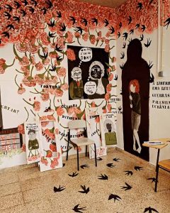 O mural “Janelas da Liberdade”, que homenageia a “Revolução dos Cravos” e questiona o papel da democracia na sociedade atual, foi inaugurado a 13 de junho, na Sala de Processos do Agrupamento de Escolas Rafael Bordalo Pinheiro (ESRBP). Tratou-se de um projeto colaborativo iniciado por três turmas do 9º ano e do grupo “Promotores da Cultura”, sob a orientação da artista professora Ana Maymone, em parceria com a artista residente Amábile Bezinelli, do Programa Nacional de Promoção do Sucesso Escolar, a professora Cecília Correia, coordenadora do Projeto Cultural de Escola no âmbito do Plano Nacional das Artes, e o professor Luís Militão. O mural cresceu para envolver toda a comunidade escolar, que contribuiu com sugestões, reflexões críticas e execução gráfica.