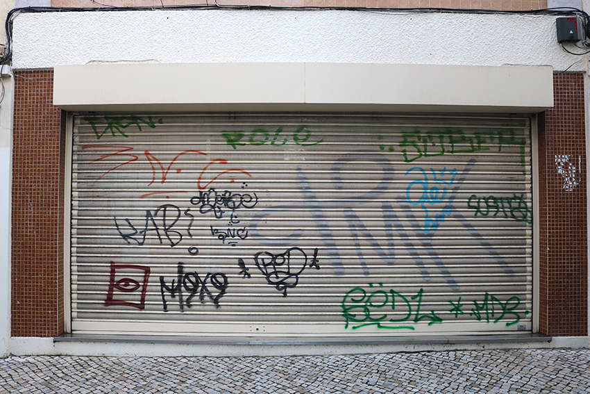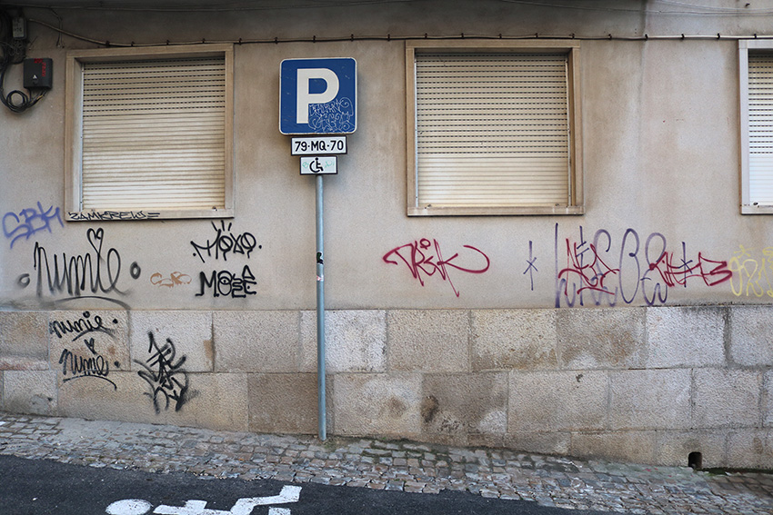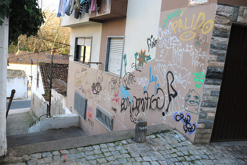 Numa terra onde até existem bons exemplos de arte urbana, proliferam pelas ruas os famosos tags. Aquelas letras iguais repetidas infinitamente em prédios novos ou recentemente pintados, em sinais, em caixas de electricidade ou correio, em portas e janelas, em montras e grades, enfim, onde der.