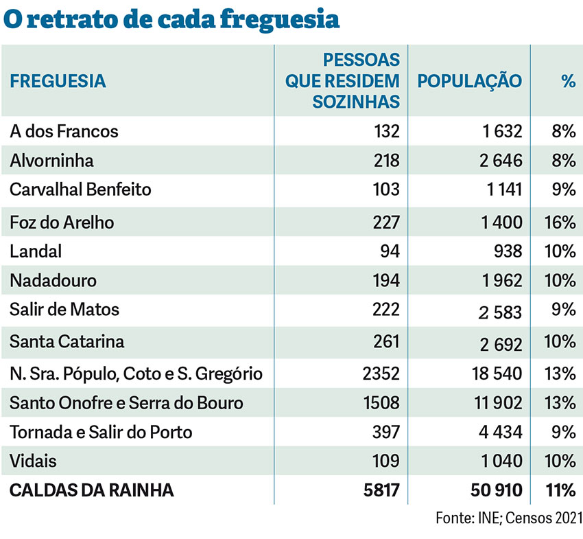 As freguesias com menos pessoas a residirem sozinhas, no concelho das Caldas, são as de A-dos-Francos e Alvorninha, onde apenas 8% da população vive sozinha. São 132 em A-dos-Francos e 218 em Alvorninha.