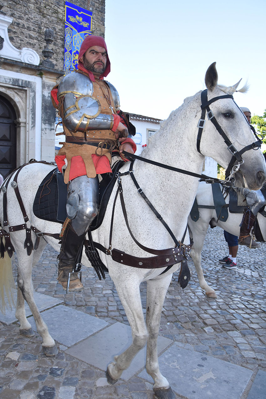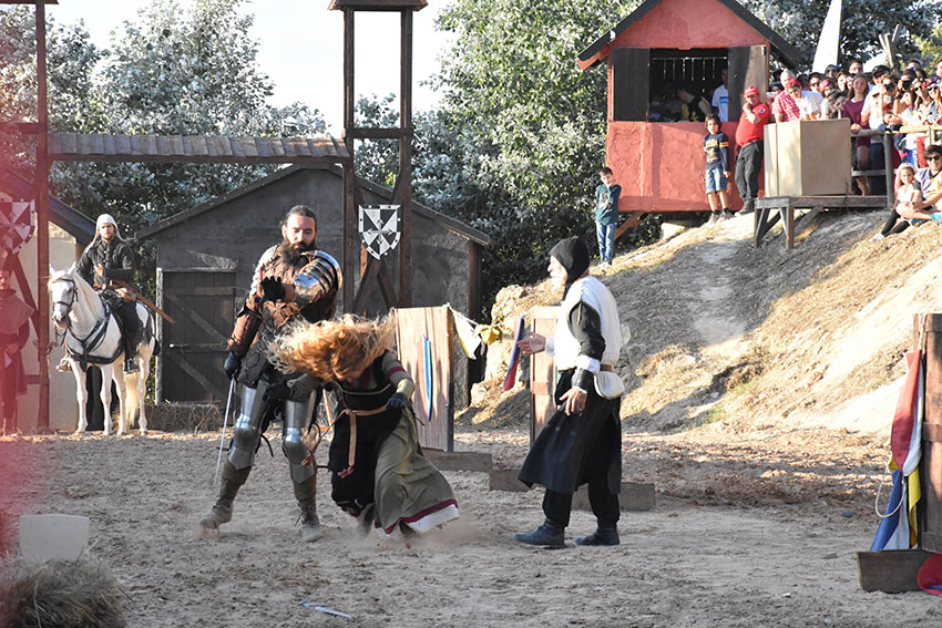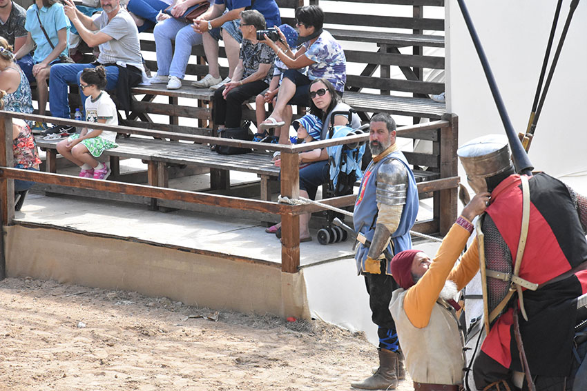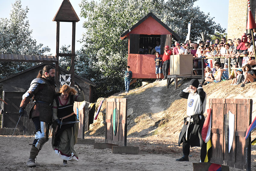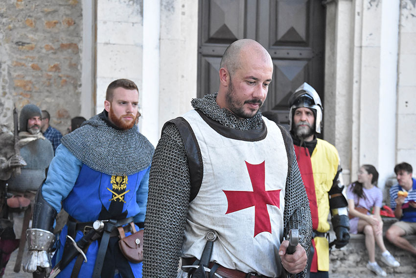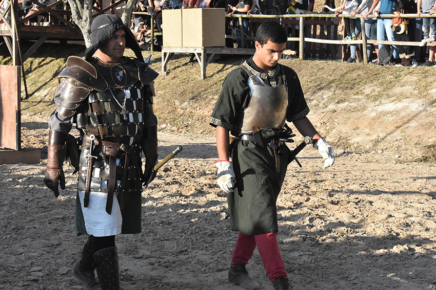 Tiago Castro, na liça conhecido pelo cavaleiro D. Tiago, é natural da Lourinhã e preside à associação Ilustre Cruzada, que conta com oito elementos activos e tem mais seis interessados em entrar. Já é um habitué deste mercado, antes como freelancer e este ano, pela primeira vez, enquanto associação. A seu lado combate a esposa, Inês Andrade, das Caldas da Rainha, que acumula esse papel com o de aguadeira nos espectáculos. Inês começou por se dedicar à arte marcial coreana e depois passou para a esgrima histórica. A sua actuação recebe sempre fortes aplausos, ou não se assistisse na liça ao caso raro de uma mulher a lutar contra um homem.