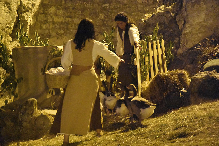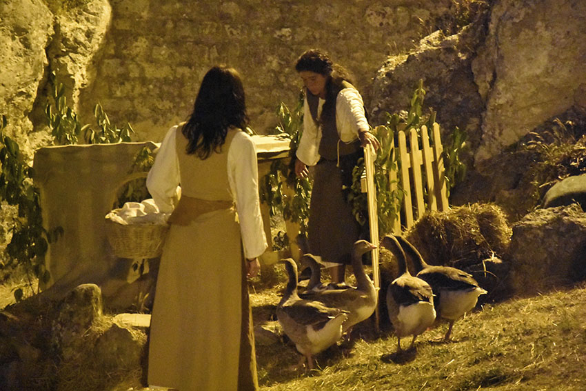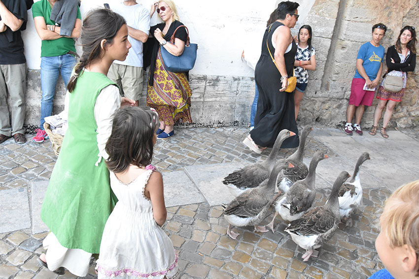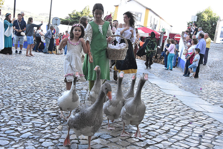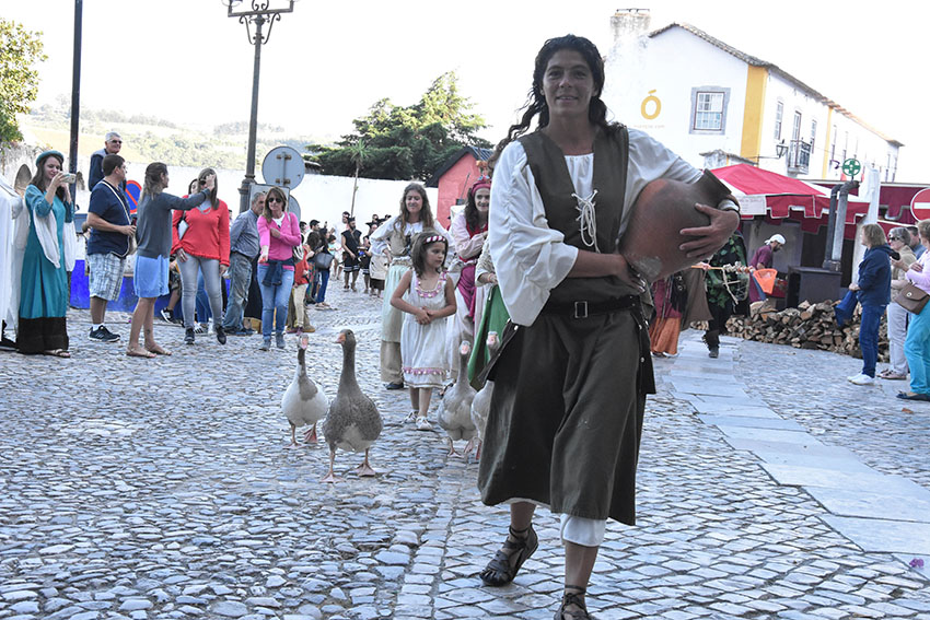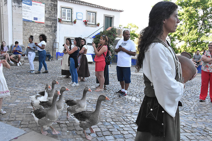“Gostarias da minha protecção?” avança a curandeira junto dos visitantes que acabam de entrar no recinto e começam a tentar perceber que surpresas lhes estão reservadas. No chão, junto da gruta onde está “alojada”, tem velas e mezinhas feitas com água, terra e outros elementos da Natureza, que depois passa nas mãos de quem recorrer à sua protecção. Esta é apenas uma das personagens que deambula pela cerca, juntamente com a aguadeira, a vendedora de peixe seco, a lavadeira, o frade franciscano e a rapariga que passeia com os gansos. Esta última é Ana Costa, do Bombarral, e está a viver a sua primeira experiência de animação no Mercado Medieval. Consigo trouxe seis gansos, domesticados, que são uma das principais atracções do evento. As aves seguem a dona nos cortejos e na abertura do mercado e, quando estão no lago, interagem com os visitantes.