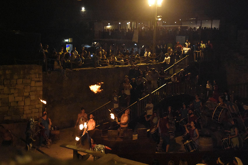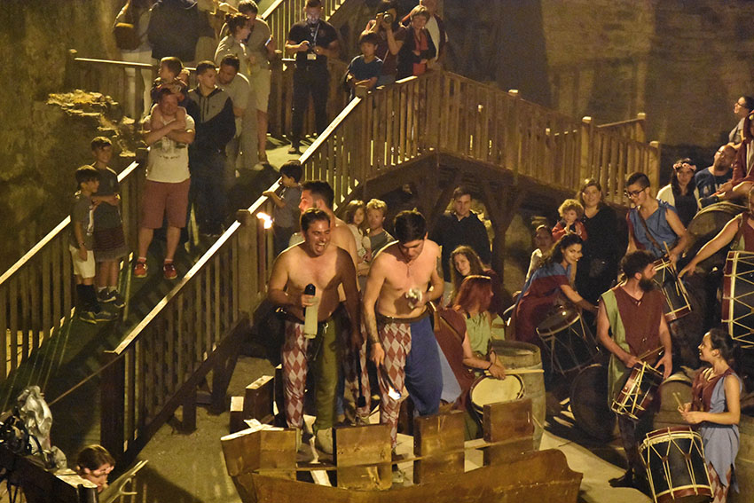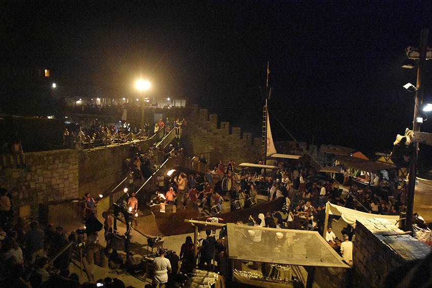 Um barco de 26 metros de comprido por 5,6 metros de largura está “fundeado” no Porto de Pipas, no fosso da cerca do castelo. Este elemento cenográfico é uma réplica de uma embarcação do século XII, retirada do fundo do Mar Mediterrâneo, perto de Barcelona, por uma equipa do Instituto Superior Técnico.