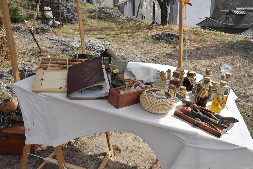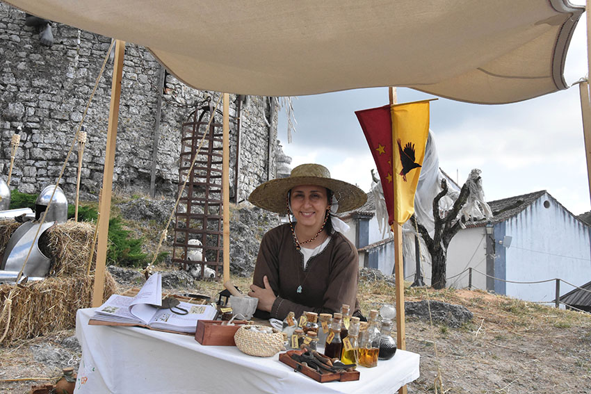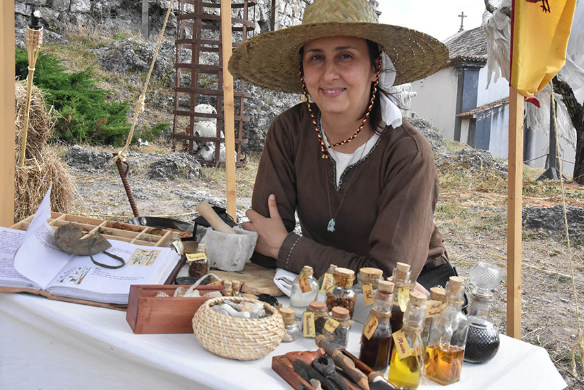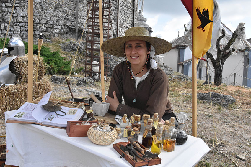 A designer Sara Fonseca, de Sintra, é, por estes dias, a curandeira e boticária do Mercado Medieval. Cuida das maleitas através do que existe na Natureza e na sua banca é possível encontrar um manancial de plantas secas, um livro de plantas e das suas características medicinais, e uma pele de cobra, “muito boa para fazer chá para curar a tosse”, explicou à Gazeta das Caldas.