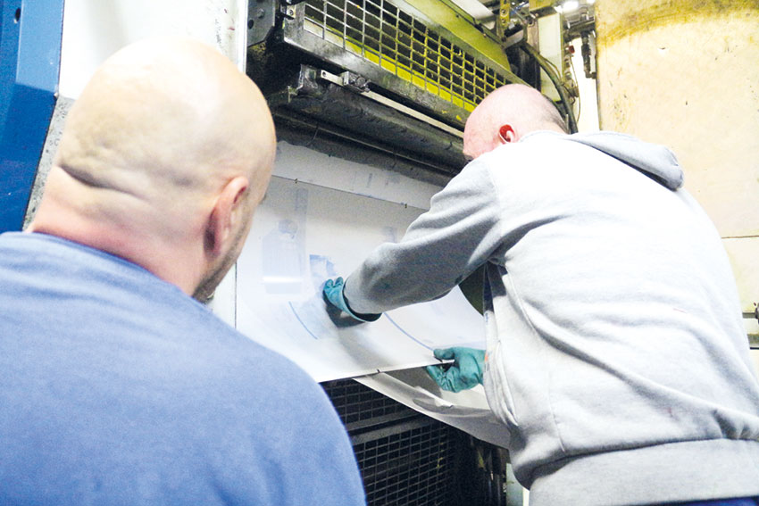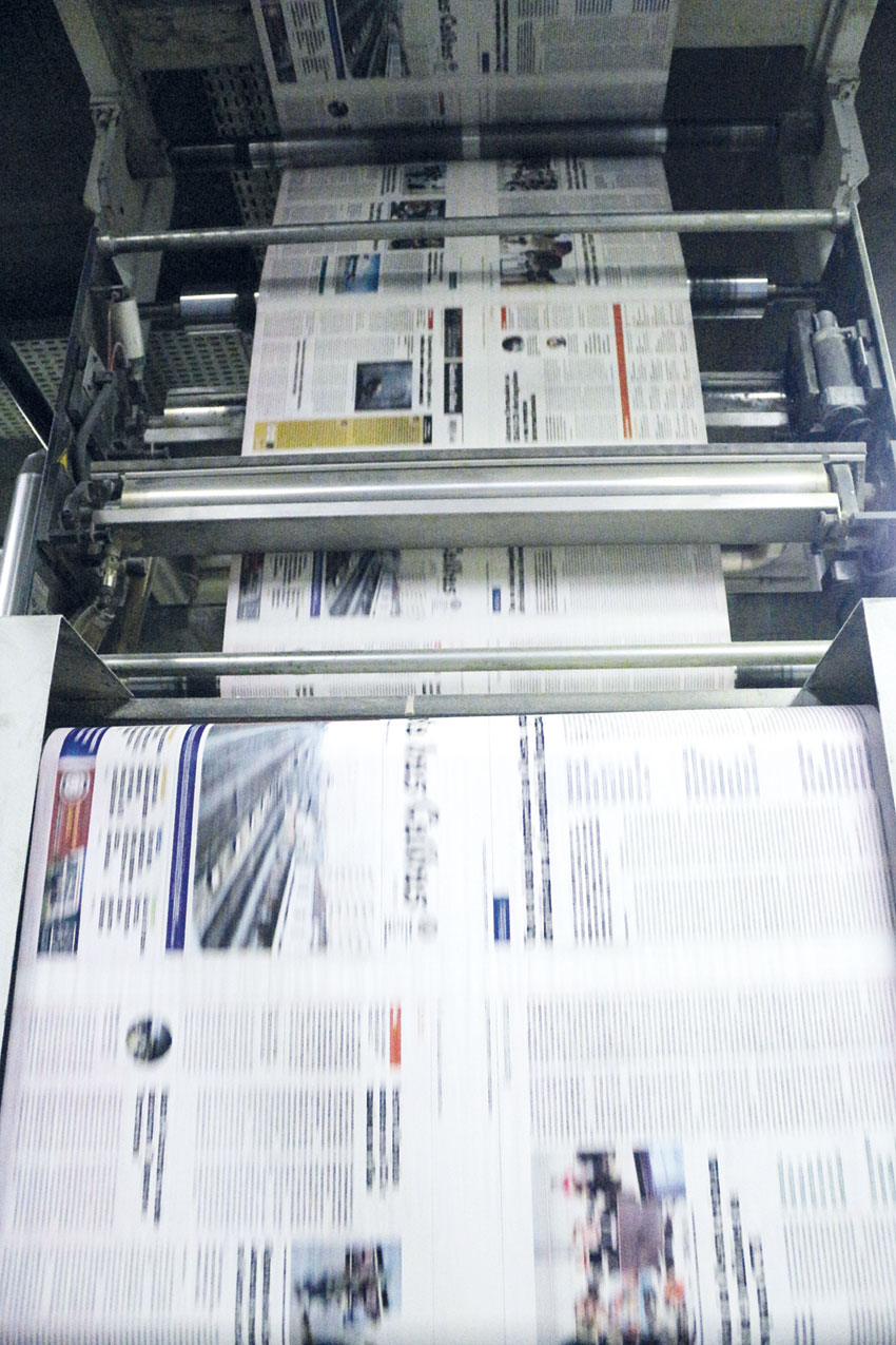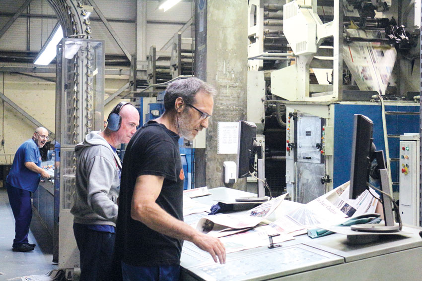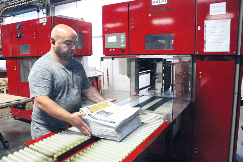 A impressão dos quatro mil exemplares semanais leva apenas cerca de 15 minutos, mas é um período de grande atividade. É que até ao momento propriamente dito da impressão, há o trabalho dos técnicos. Recorrendo a um conta-fios (tipo uma lupa), vão fazendo os acertos para o jornal sair com nitidez e com as cores corretas. Ora colocam mais magenta aqui, ora acertam o cilindro do azul meio milímetro para o lado para a imagem não sair “tremida”.