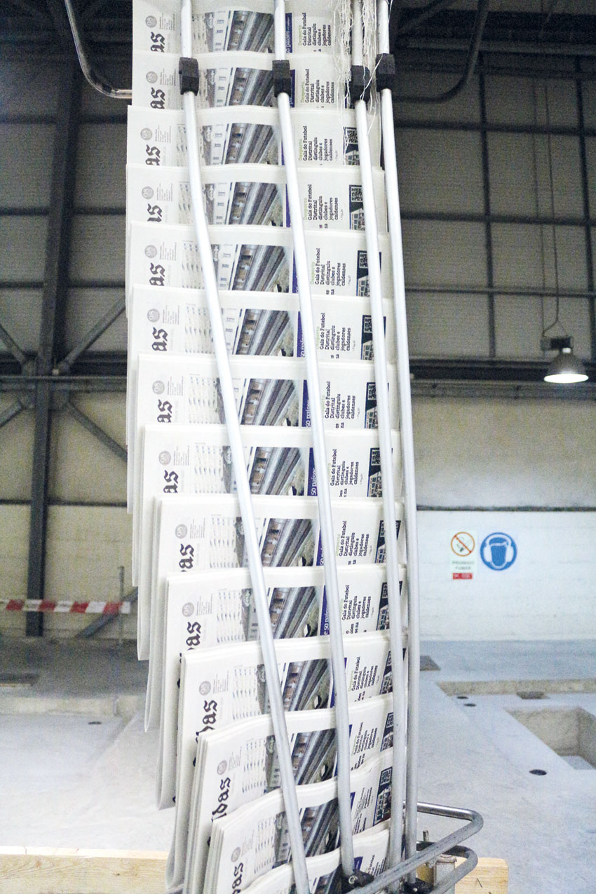 Depois de impresso, o papel passa ainda por uma estufa, para secar, e por uma zona de arrefecimento com água a dez graus. Posteriormente uma outra máquina cortará à medida e dobrará as páginas, saindo então já pronto pela passadeira que o levará à expedição.
