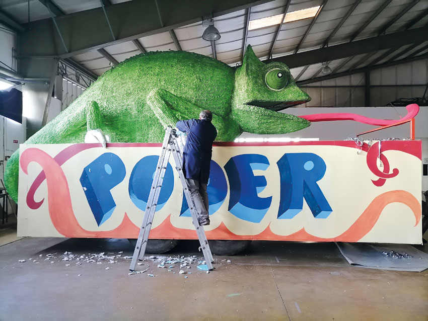 Já na Expoeste está a trabalhar o Rancho da Fanadia. Sérgio Pereira, a meio de terminar as patas do animal, conta-nos que o camaleão, “que representa o poder eternizado”, vai estar quase a engolir um homem vestido com uma t-shirt onde se lê: “VM” e que, na língua do camaleão luta para não ser engolido. Este ano vão desfilar cerca de 40 pessoas por esta associação e os fatos são concebidos também por voluntários na associação.