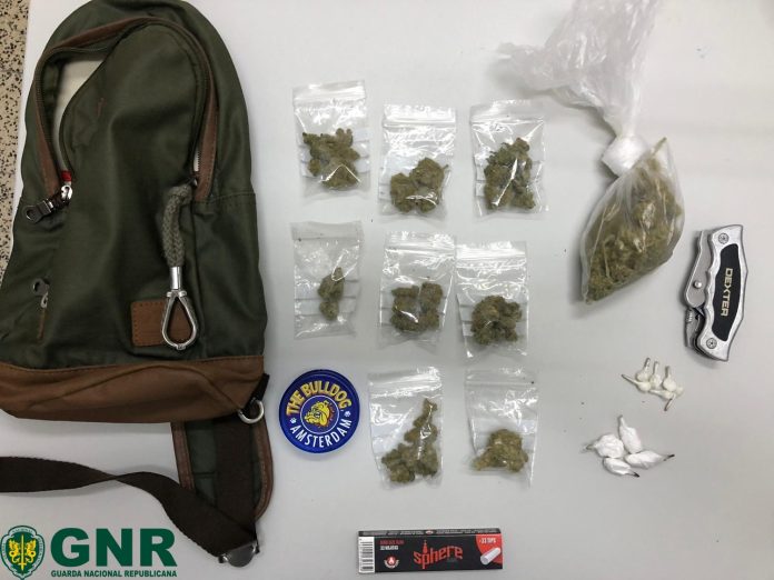 O indivíduo foi abordado pelos militares numa ação de fiscalização rodoviária, tendo a busca ao veículo culminado na apreensão de 18 doses de canábis e 28 doses de cocaína, que se encontravam no interior de uma mochila do suspeito.