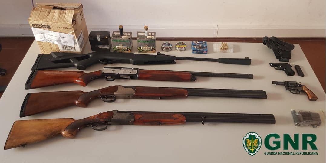 No decorrer das buscas domiciliárias, a GNR apreendeu diverso material, destacando-se três espingardas, um revólver, uma pistola, uma arma de ar comprimido, 199 munições de diversos calibres.