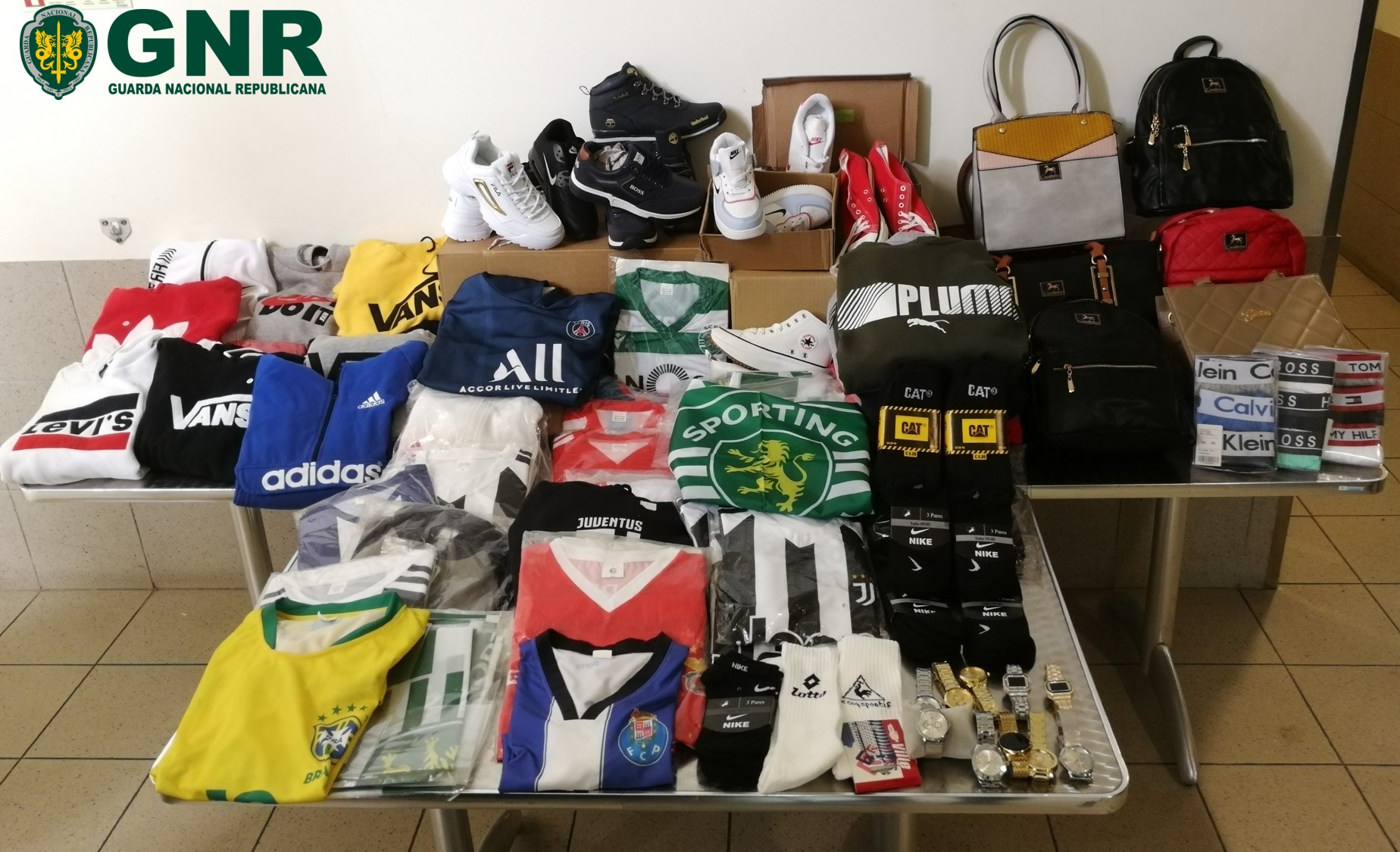 No âmbito de uma operação, os militares identificaram nove pessoas por contrafação, resultando na apreensão de diverso material desportivo, nomeadamente 730 peças de vestuário, 887 peças de equipamento desportivo, 1.185 pares de meias e roupa interior, 207 pares de calçado, 100 malas, 16 cintos e 42 relógios.