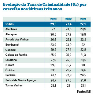 Em termos absolutos, os concelhos onde se registam mais crimes nesta região são os Torres Vedras (2.410 crimes em 2023), Alcobaça (1.513), Alenquer (1.424) e Caldas da Rainha (1.355 no último ano). Mas os dados permitem também uma análise mais detalhada e fiável, por exemplo, ao nível da taxa de criminalidade. E, nesse campo, é possível perceber que os concelhos que apresentam uma mais alta taxa de criminalidade no Oeste são os de Peniche, Nazaré e Sobral de Monte Agraço (que curiosamente até foi o único da região no qual a taxa desceu), que são os únicos três da região que ficam acima da média nacional. Ou seja, analisando a taxa de criminalidade a leitura é de que o Oeste é um território seguro. É que a região fica abaixo da média nacional e só três dos doze concelhos ficam acima da média nacional. Óbidos fica próximo desses valores, mas ainda abaixo. Já o concelho das Caldas aparece como o segundo território mais seguro da região, logo atrás do Bombarral. A seguir ao município termal aparece Arruda dos Vinhos, Alcobaça e Cadaval, seguindo-se Lourinhã e Torres Vedras.