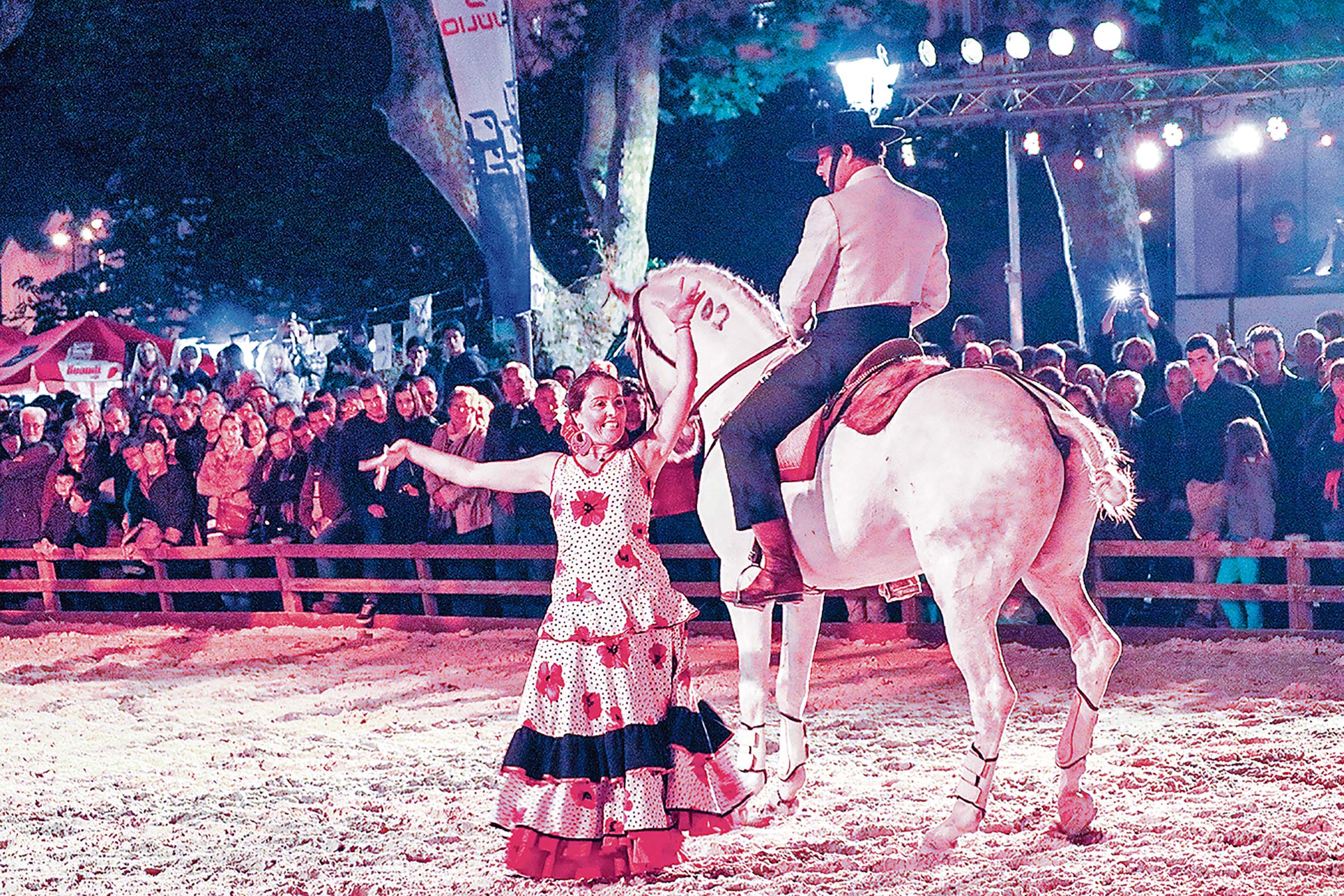 Uma bailarina dança em frente a um cavalo, seis cavaleiros com varas a arder fazem uma coreografia com fogo, uma bailarina faz dança vertical enquanto um cavaleiro a pé conduz o seu cavalo. Há malabares com fogo, danças sevilhanas e um cavalo iluminado por fios de luz que desfila pelo picadeiro. No final, uma valente salva de palmas para os artistas.