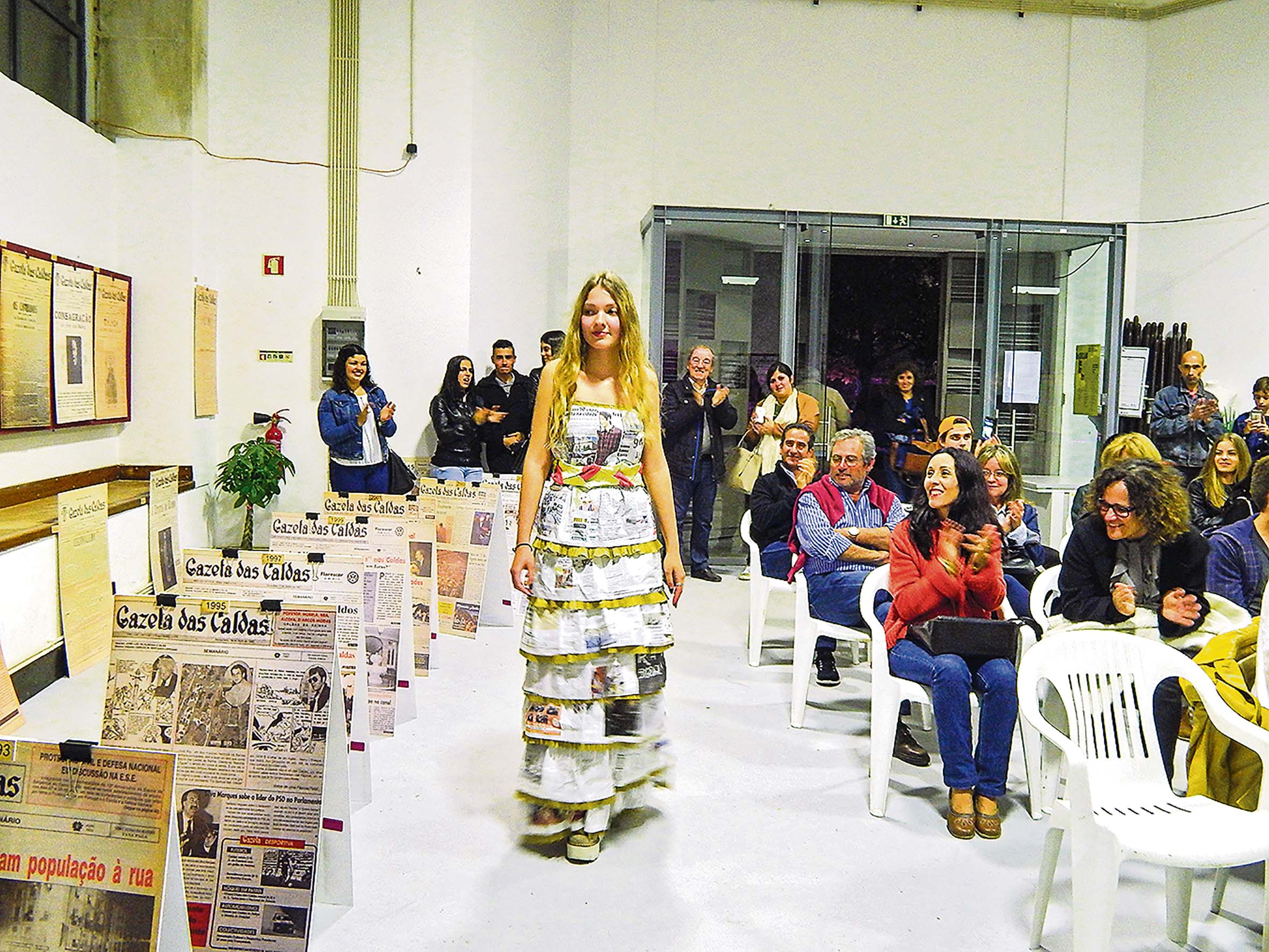 Um vestido feito com páginas da Gazeta das Caldas: eis a proposta da aluna, que se inspirou na iniciativa “90 anos, 90 capas contam a História”, promovida por este jornal no âmbito do seu 90º aniversário (celebrado a 1 de Outubro). Nesta actividade, 90 alunos daquela escola desfilaram pela cidade com 90 primeiras páginas da Gazeta, uma por cada ano de vida do semanário. São precisamente as páginas que reportam este evento aquelas que dão forma ao peitilho do vestido.
