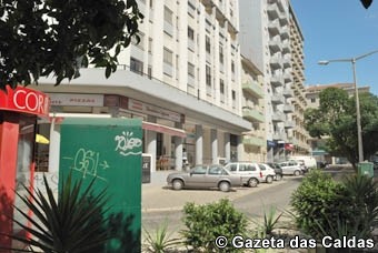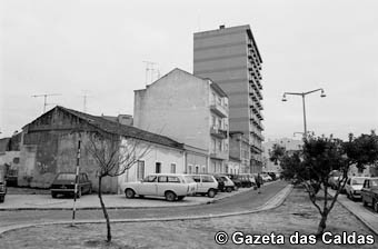 Ao fundo, vê-se um pouco do edifício que foi sede dos Bombeiros Voluntários das Caldas da Rainha e onde funcionaria depois o Bingo. Hoje paira no local um centro comercial que está vazio porque teve azar no tempo escolhido – terminou quando a crise já se fazia sentir e não há quem lhe alugue espaços.