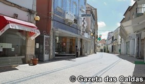 Na foto da direita, vê-se a rua sem trânsito que é proibido e ao meio há uns bancos com umas flores. A maior parte das vezes cheios de latas de bebidas, beatas etc. De 26 estabelecimentos comerciais que existiam, já fecharam uns tantos, os moradores estão isolados, nem trânsito nem comércio nem nada, um autêntico deserto.