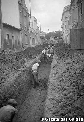 Obras de regeneração urbana na década de 40 nas Caldas da Rainha? Não. O próprio conceito – regeneração urbana – era provavelmente desconhecido na época, embora facilmente entendível. Naquele tempo a prioridade era a infra-estruturação da cidade e o mais certo é ser esta vala que se vê na foto da esquerda destinada à rede de esgotos.