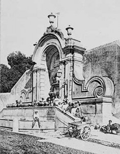 “A água pública e potável desta Vila se divide em três fontes em que se acomodam sete bicas, na figura das sete Estrelas nimbosas, chamadas Plêiades. (…) Na parte mais alta da Vila, no princípio da calçada chamada da Rainha, fim da povoação, e princípio do Campo, se vê a terceira fonte em lugar escolhido, com boa ponderação para maior comodidade assim dos moradores, como dos passageiros, e hóspedes; com cinco bicas na figura de cinco Estrelas com outra fita volante, e a inscrição seguinte: Pleiadumque aliae quinque; sat, unde bibas.