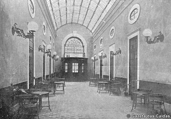 Este, o nosso, foi construído para propiciar uma entrada de (algum) aparato ao Parque e marca presença abundante nos postais editados no princípio do século XX, ora desabitado, ora povoado de damas e cavalheiros em alegre convívio, no meio de motivos florais e cadeirões de verga. Sinais de uma época e de um edifício que Ramalho Ortigão descreveu em récitas e saraus e Rafael Bordallo Pinheiro desenhou em festas e danças (aproveitando o ensejo para desancar a figura do Conselheiro Pim – um dos seus ódios de estimação: Pimentel, o administrador hospitalar), quando a aristocracia e uma dada burguesia de posses e larga fazenda, se entregava aos ócios e lazeres da vilegiatura caldense, em idas às termas, jogos de salão, burricadas, passeios de barco na lagoa e piqueniques no campo ou na mata. Outros tempos, como diz o fado… “. Foi assim que o meu bom amigo José Carlos Faria me relatou e me ajudou a situar históricamente o “nosso” céu de vidro. Continuando, e entrando já em tempos por nós vividos, podemos dizer que chegam-nos, de mansinho, memórias de juventude, das conversas em roda de amigos nas cadeiras «aviadoras» no recanto conhecido como «aldeia dos macacos», dos bailes do casino, e do céu de vidro, refúgio para arejar um pouco (as meninas) e para refrescar com um copo (os rapazes), ponto de cruzamento de olhares, de namoros ingénuos tão ferventes de amor que o céu de vidro não era céu nem de vidro, era universo de estrelas de cristal, isso sim.