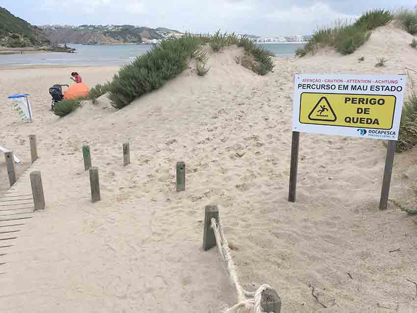 Travessas de madeira levantadas, zonas cobertas de areia e outras já sem vestígios do caminho, caracterizam aquele equipamento que, nalguns casos, até representa algum grau de perigosidade. É, pelo menos, o que diz a Docapesca, entidade responsável pela sua manutenção, que até colocou sinais de perigo para os caminhantes.