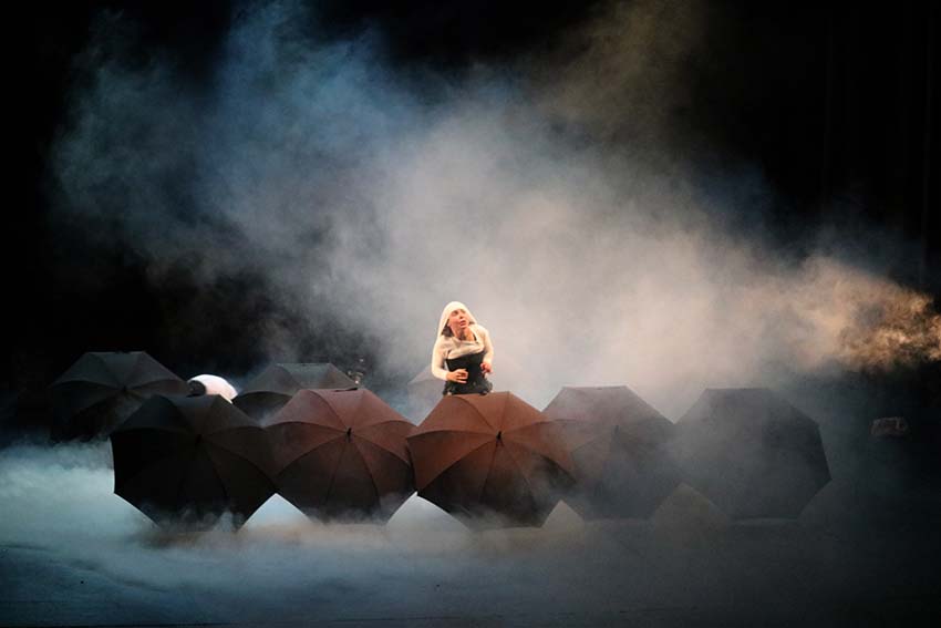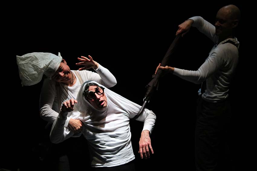 Com sacos de plástico nos bolsos, imitam o som da chuva. Com os mesmos sacos recriam a mitra branca do Papa e a barba preta de um rabino. Usam também guarda-chuvas com os quais representarem um microfone, um gravador ou um livro. É ainda com os chapéus de chuva que criam o cenário: espalhados pelo palco os chapéus permitem aos actores andarem (de gatas) pelo palco, sem que o público perceba por onde.