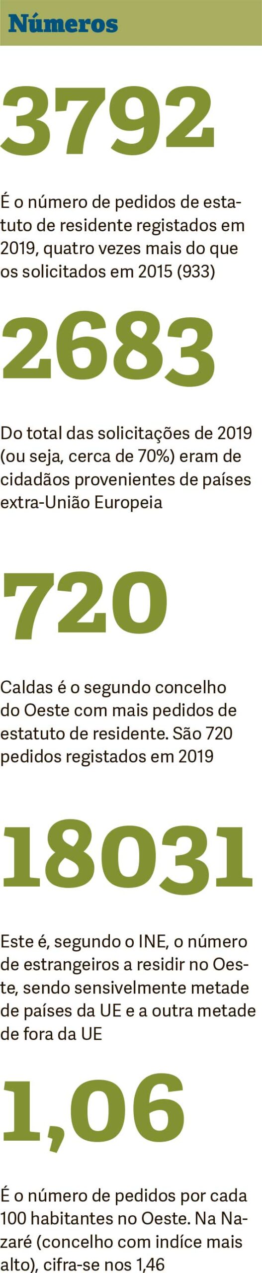 O concelho que regista mais pedidos é o de Torres Vedras (com um total de 825, 700 dos quais de fora da UE). Segue-se as Caldas com 720 solicitações do estatuto de residente, entre as quais 265 de cidadãos dos 28 Estados-Membros da União Europeia e 455 de fora. Alenquer é o terceiro concelho do Oeste com mais pedidos, num total de 601, dos quais apenas 67 da UE.