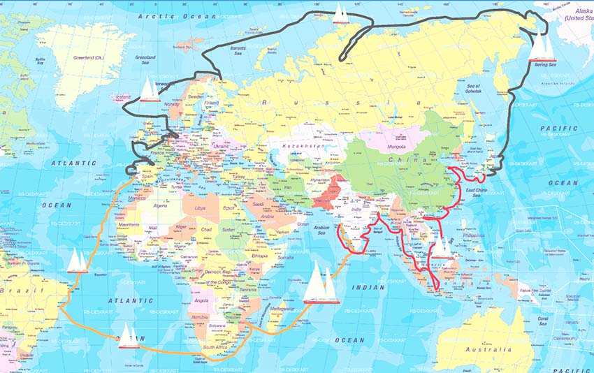 E por onde irá passar este veleiro? “Primeiro vamos ao Brasil depois Maputo e Calcutá”, disse o comandante, explicando que irão zarpar de Lisboa. Depois da Índia, o veleiro navegará com destino a Macau, seguindo a Rota da Seda. Posteriormente a viagem segue pelo Sudoeste Asiático até chegar ao Japão. Esta epopeia pretende unir as rotas de Pedro Álvares Cabral (Brasil), de Vasco da Gama, repetindo também a viagem que David Melgueiro fez pelo Ártico.