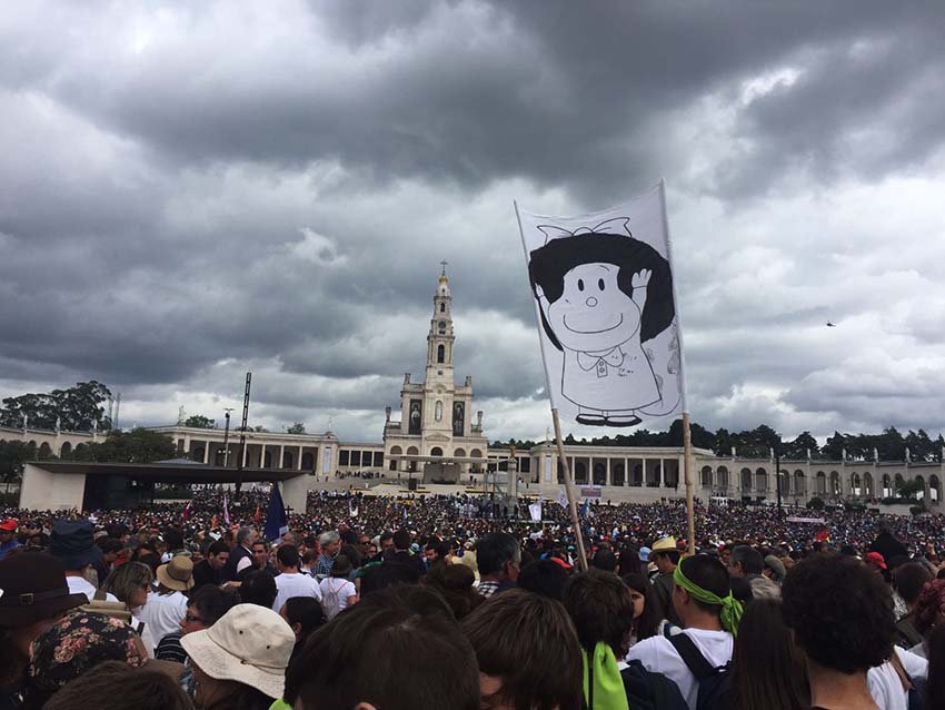 Mas nem só os estrangeiros viajaram das Caldas até Fátima em peregrinação. Certamente muitos caldenses o fizeram, entre eles um grupo de 30 jovens de 13 e 14 anos da catequese caldense, e alguns pais, tiveram a oportunidade de estar a escassos metros do Papa Francisco, a quem brindaram com uma tarja na qual desenharam a personagem de banda desenhada Mafalda, cujo criador Quino é argentino, tal como o Papa. “Quisemos brindá-lo com um miminho, humor e alegria, estivemos o mais perto possível, mas mesmo sem lhe poder tocar estes jovens perceberam que só de estarmos todos junto já lhes deu muita alegria”, conta Margarida Varela, catequista que acompanhou os jovens.